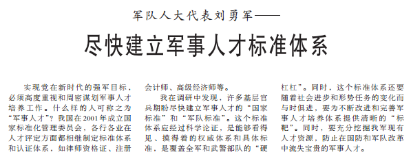 实现党在新时代的强军目标,必须高度重视和周密谋划军事人才培养工作。我在调研中发现,许多基层官兵期盼尽快建立军事人才的“国家标准”和“军队标准”。这个标准体系应经过科学论证,是能够看得见、摸得着的权威体系和具体标准,是覆盖全军和武警部队的“硬杠杠”。同时,这个标准体系还要随着社会进步和形势任务的变化而与时俱进,要为不断改进和完善军事人才培养体系提供清晰的“标靶”。同时,要充分挖掘我军现有人才资源,防止在国防和军队改革中流失宝贵的军事人才。