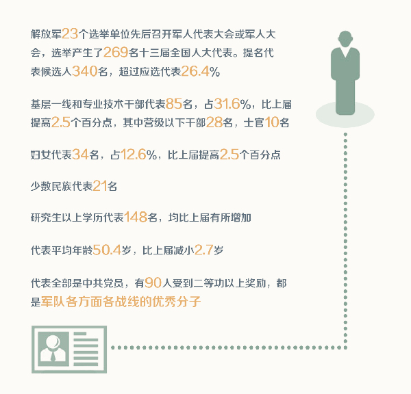 纵观两会,解放军和武警部队代表团的代表结构较十二届相比进一步优化,充分体现了广泛性、先进性和代表性。