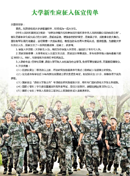 一直以来,国家不仅鼓励大学生应征入伍,还相继出台了一系列优惠政策。越来越多的高素质大学生、青年才俊加入到携笔从戎,保家卫国的伟大事业中来,为军队人才阵容添加了新鲜的血液。