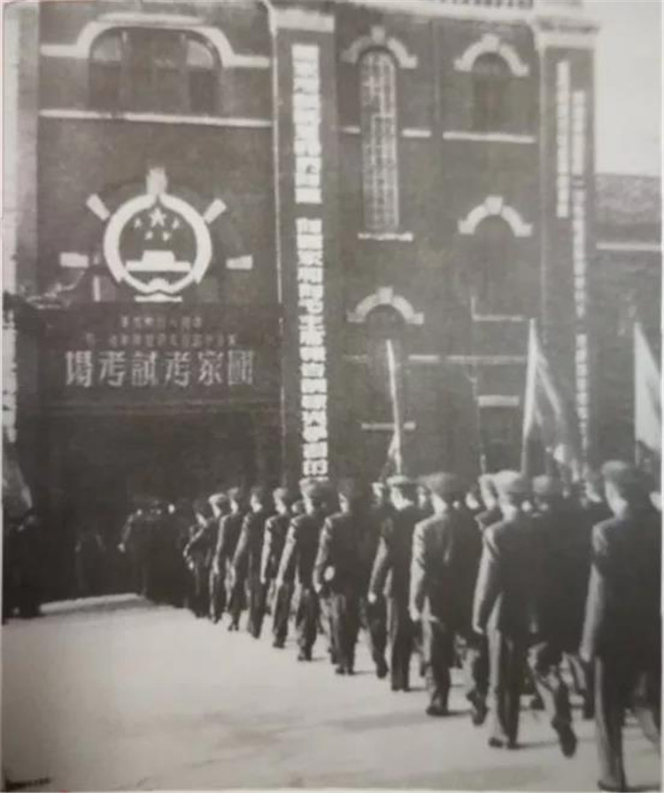 这天,考场门楼正中间悬挂着一枚金色的国徽,两边悬挂着大幅标语:“国家考试就是我们向党向国家向毛主席报告训练与学习的成绩”,“保证参加国家考试的学员争取优秀成绩是当前全院共同的任务”。