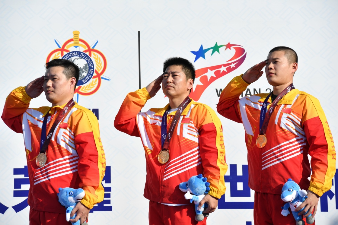 10月19日,在武汉举行的第七届世界军人运动会射击项目男子25米手枪军事速射团体比赛中,中国队夺得冠军。这也是中国代表团在本届军运会上的首枚金牌。中国队选手金泳德(中)、谢振翔(左)、姚兆楠在颁奖仪式上。新华社记者姜克红摄