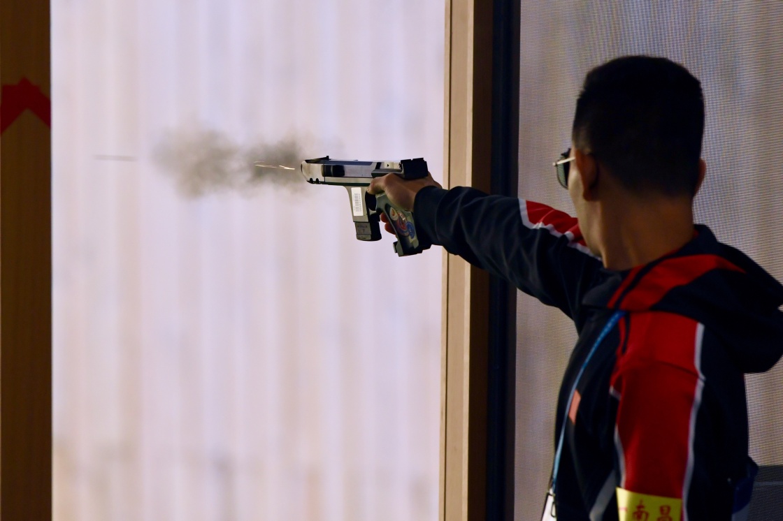 10月19日,在武汉举行的第七届世界军人运动会射击项目男子25米手枪军事速射团体比赛中,中国队夺得冠军。这也是中国代表团在本届军运会上的首枚金牌。中国队选手高铮在比赛中。新华社记者姜克红摄