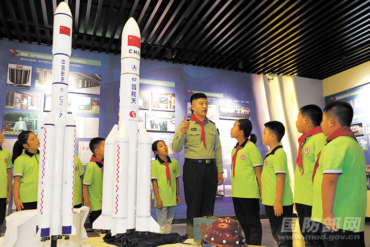 国庆节前夕,黑龙江省哈尔滨警备区联合市教育局在哈尔滨市育红小学开展国防教育进校园活动。图为警备区战士常智科在该校“两弹一星”展览馆为学生讲解航天知识。 吕衍海 摄