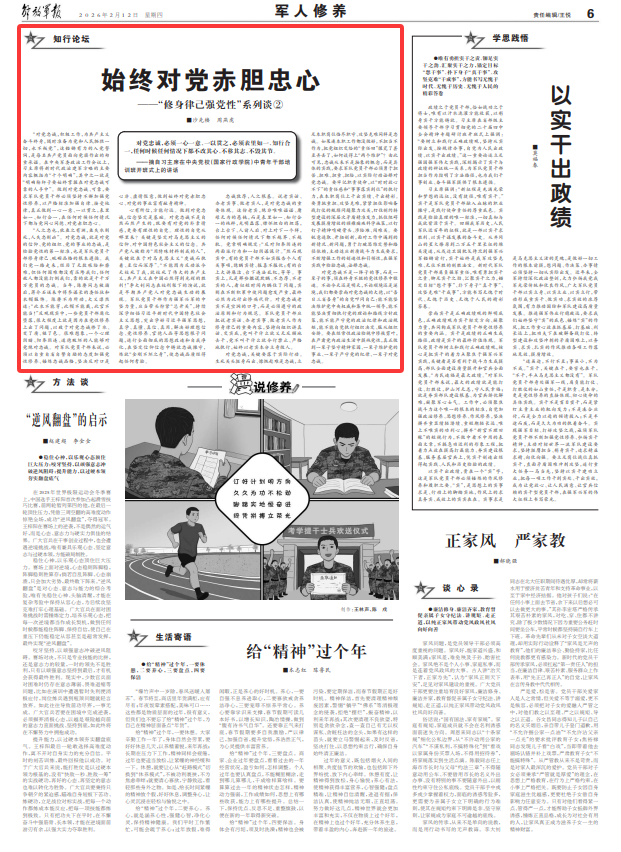 “人之忠也,犹鱼之有渊,鱼失水则死,人失忠则凶”。对党忠诚,就是对党的信仰、党的组织、党的事业的忠诚,是检验党性的第一标准,也是军队党员干部修身律己、砥砺品格的根本遵循。我们党一路走来,经历了无数艰险和磨难,但任何困难都没有压垮我们,任何敌人都没能打倒我们,靠的就是千千万万党员的忠诚。当年,陈赓同志被捕后,蒋介石送来中将参谋长的委任状和衣帽服饰。陈赓不为所动,大义凛然道:“此衣不能穿,此帽不能戴,此官不能当!”反观现实中,一些党员干部腐化堕落,很大程度上就是因为在党性修养上出了问题,以致于对党忠诚掺了水、变了质、褪了色。很难想象,一个心理阴暗、阳奉阴违、道德败坏的人能够对党绝对忠诚。对军队党员干部来说,必须以自重自省自警自励的态度加强党性修养、锤炼忠诚品格,坚决反对口是心非、虚情假意,做到始终对党赤胆忠心、对党的事业富有献身精神。