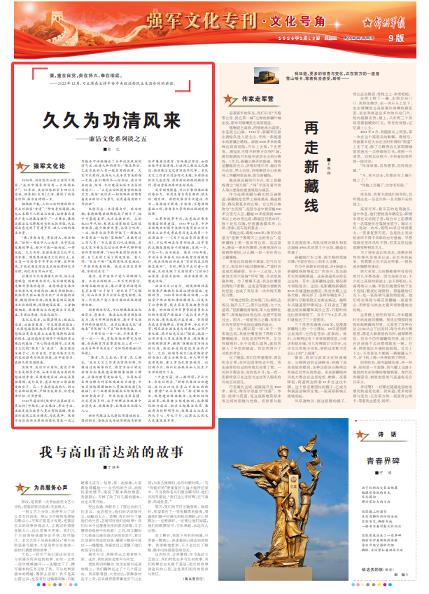 “千仓万箱,非一耕所得;干天之木,非旬日所长。”新时代廉洁文化建设,我们应以咬定青山不放松的执着,秉持“永远在路上”的清醒与坚定:既要建好阵地载体,也要抓好内涵滋养;既要健全制度机制,也要强化执行落地,切实立起廉洁光荣、廉政有为的鲜明导向,使廉洁文化真正内化于心、外化于行,让清正之风长久充盈座座军营。
