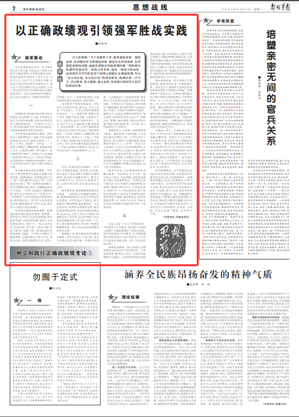 习主席强调:“当干部就要干事,就要创造业绩。创造业绩,必须解决好为谁创造业绩、创造什么样的业绩、怎样创造业绩的问题,也就是要解决好政绩观问题。”国防和军队现代化建设是一项伟大的事业,也是一场接力的远征。必须教育引导军队党员干部树立和践行正确政绩观,牢记“为人民扛枪、为人民打仗”的神圣职责,做到只要一声令下,召之即来、来之能战、战之必胜,有效履行新时代人民军队使命任务。