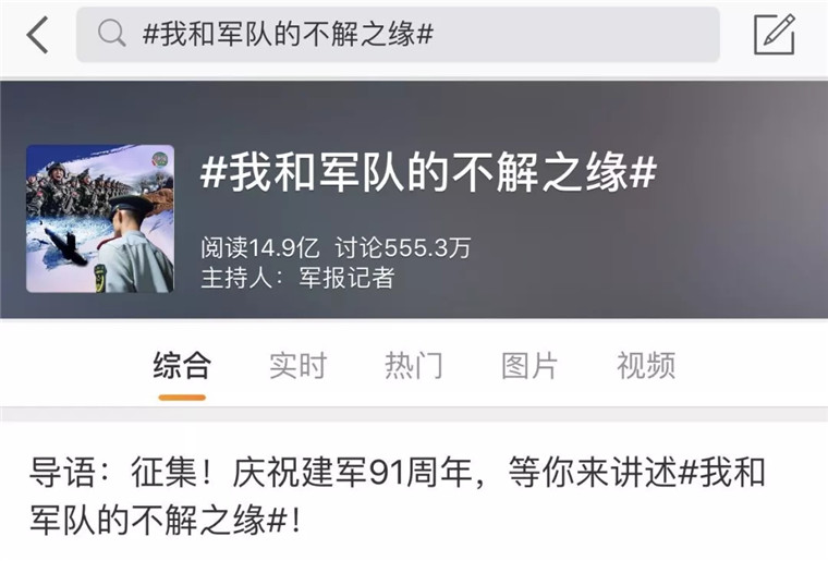 八一微博话题阅读量创14.9亿新纪录。每年的建军节宣传都是我们的“主场宣传”,2018年8月1日,庆祝建军91周年军报微博话题“我和军队的不解之缘”上线,短短15天阅读量达14.9亿,创下微博话题阅读量的新纪录。