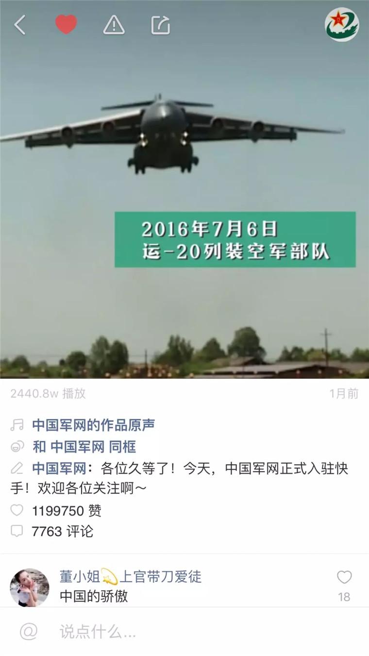 三是以权威性、专业性和独家性拓展新阵地。传播改变世界,但是前提条件是必须要精准传播和有效传播。2018年短视频发布平台发展迅猛,“抖音”国内日活跃用户1.5亿,“快手”日活跃用户1.2亿。读者在哪里,受众在哪里,宣传阵地就在哪里,主流也就在哪里。2018年10月30日,中国军网入驻抖音、快手短视频平台。抖音第一条军事短视频《中国军网来了》发布5小时,播放量超过1000万,上线7个小时粉丝量突破100万,获赞达105.3万,创下政务抖音号最快涨粉记录。