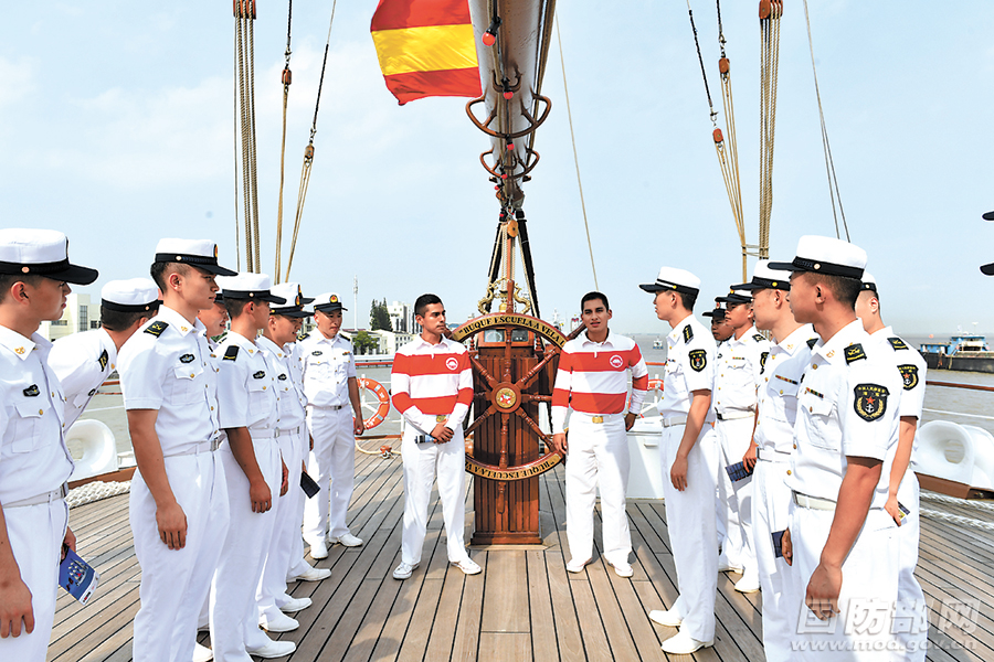 “联合”号风帆训练舰18日到访以来,码头里、甲板上、船舱内,中秘两国海军官兵友好交流的身影处处可见,共同汇成军港内的一道亮丽风景。这次访问,也是秘鲁海军军舰时隔15年再次访华。