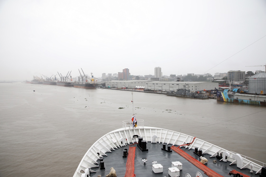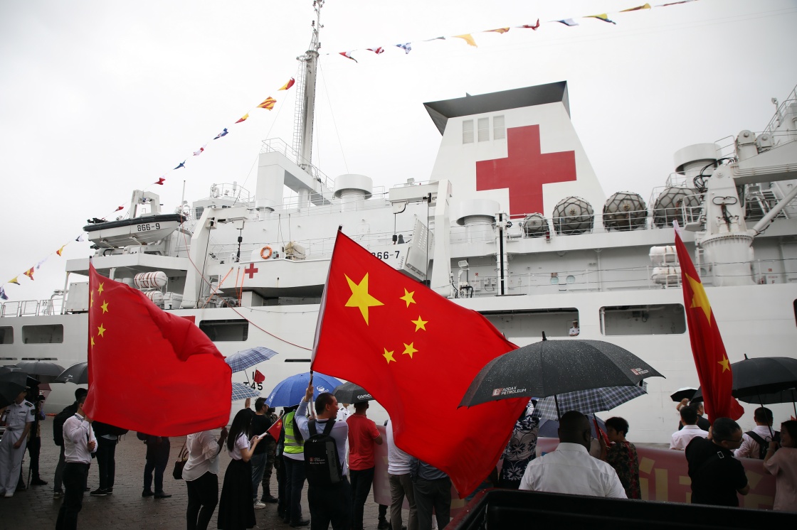 当地时间10月7日,执行“和谐使命-2024”任务的中国海军“和平方舟”号医院船抵达喀麦隆杜阿拉港,开始对喀麦隆进行为期7天的友好访问,并提供医疗服务。这是“和平方舟”号医院船首次访问喀麦隆。新华社发(刘志磊摄)