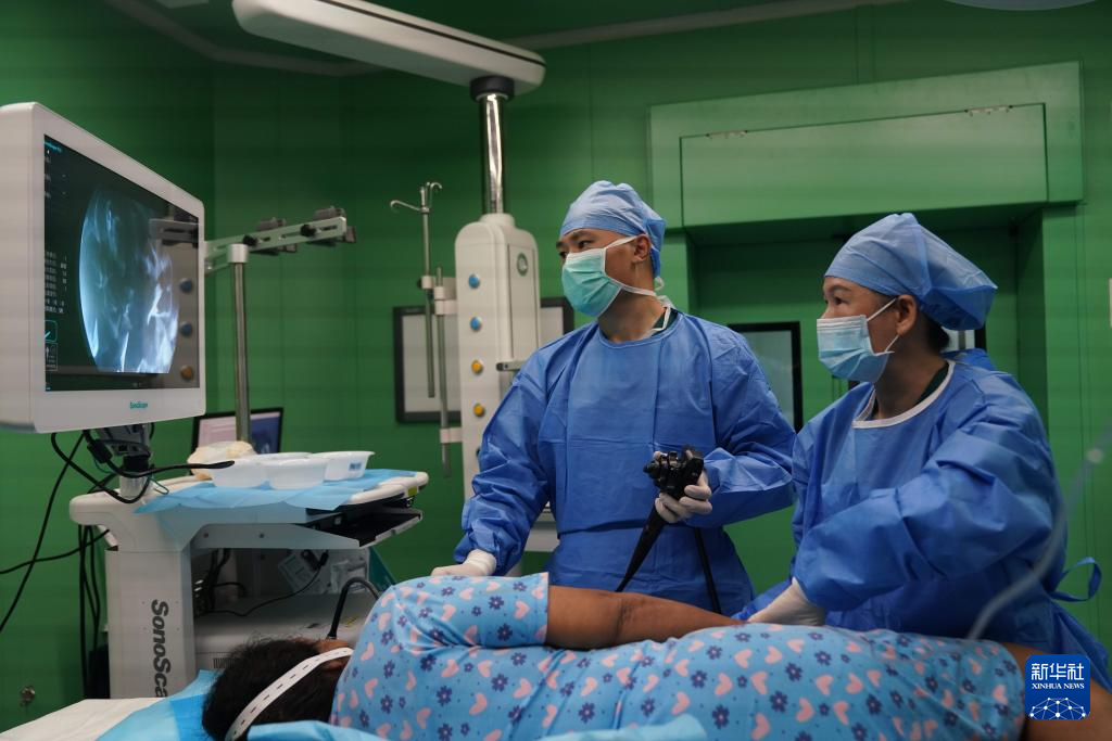 12月6日,中国海军“丝路方舟”号医院船在牙买加蒙特哥贝提供医疗服务期间,医护人员为患者进行胃肠镜检查。新华社发(何雨谦摄)