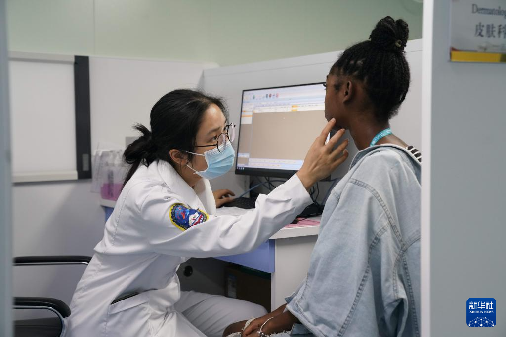 12月7日,中国海军“丝路方舟”号医院船在牙买加蒙特哥贝提供医疗服务期间,皮肤科医生为患者诊疗。新华社发(何雨谦摄)