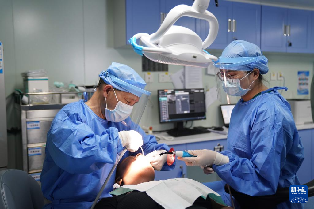 12月9日,中国海军“丝路方舟”号医院船在牙买加金斯顿提供医疗服务期间,牙科医护人员为患者洗牙。新华社发(何雨谦摄)
