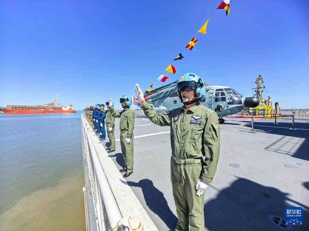 这是中国海军舰艇首次停靠乌拉圭。图为码头欢迎仪式。新华社发(崔晓洋 摄)