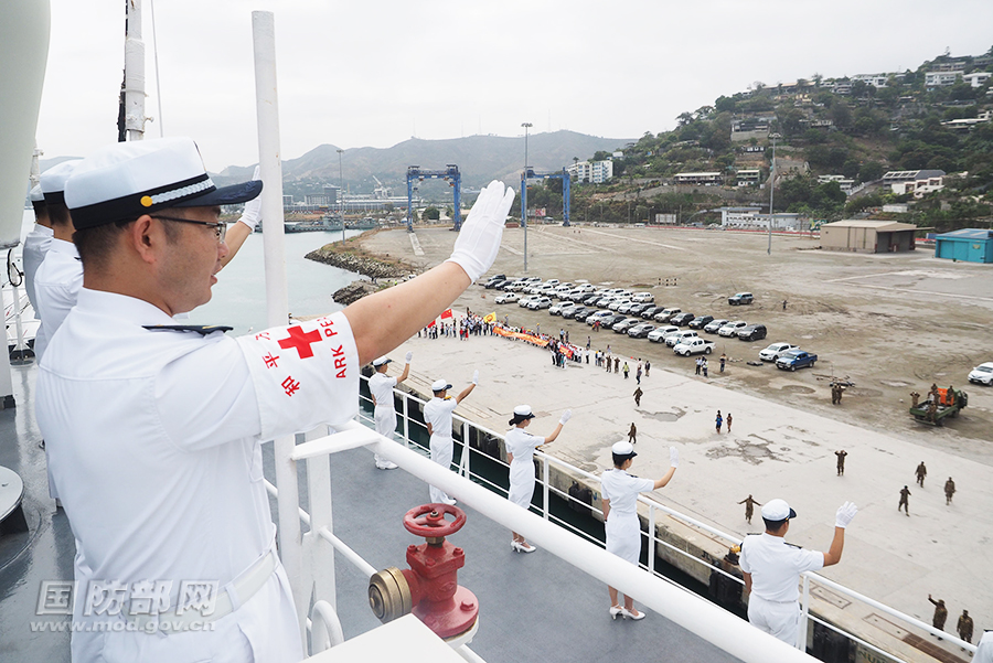 当地时间7月18日,中国海军和平方舟医院船缓缓驶离巴布亚新几内亚莫尔兹比港时,和平方舟医护人员向送行人群挥手告别。江山 摄