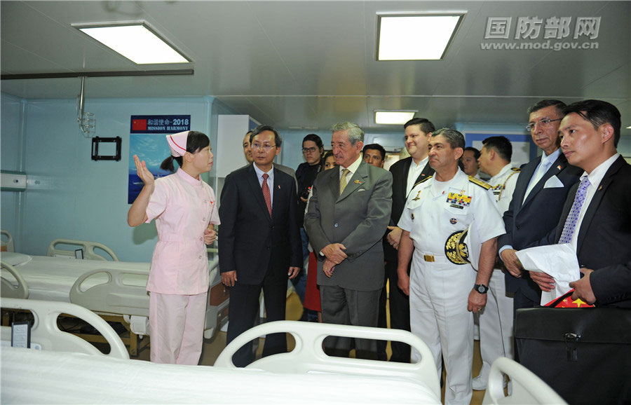 厄国防部长奥斯瓦尔多·哈林(前左三)等军政官员在中国驻厄大使王玉林(左二)陪同下参观和平方舟医院船。