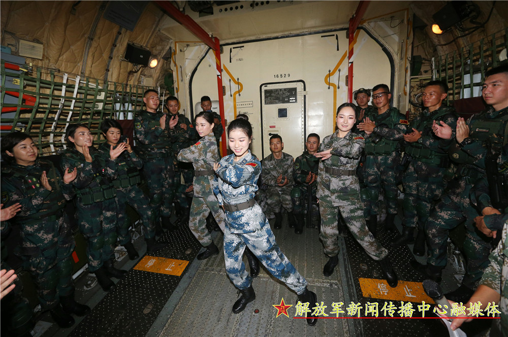 文工队员在机舱里为长途机动的参演部队表演节目 易定 摄