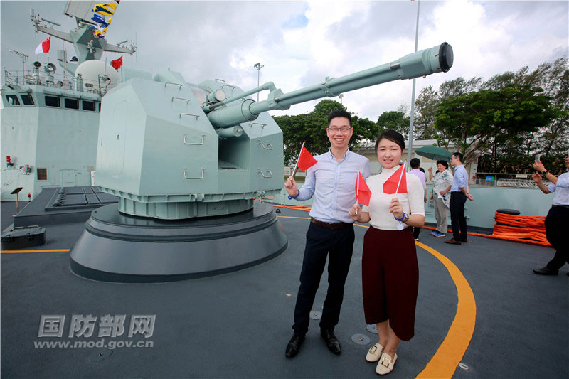5月13日,湘潭舰在新家坡樟宜港举办舰艇开放日活动当天,参观人员纷纷与舰艇、海军官兵合影留念。张千 摄