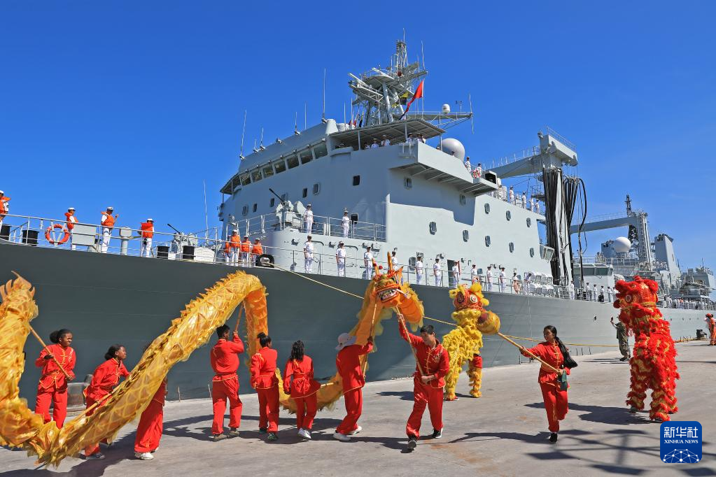 欢迎仪式上,马方组织了舞龙、舞狮和当地特色舞蹈表演,学生代表为编队指挥员献上鲜花。仪式结束后,欢迎人群分批次登舰参观。