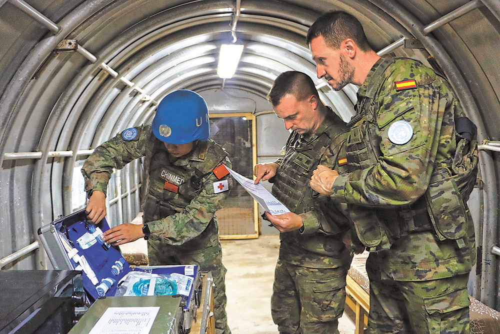 联黎部队巡查人员对分队掩体内的医疗物品进行核查。曾德乐摄