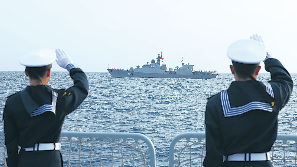 中方官兵列队与越方官兵挥手告别。贾晓鹏摄