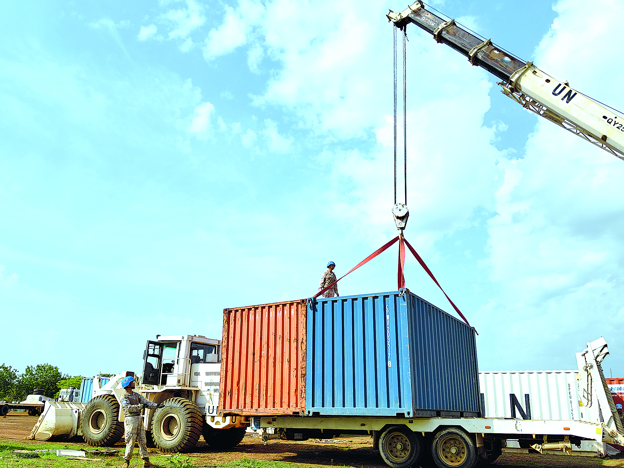 此次施工累计吊运集装箱16个,填装沙土500余立方,动用各型机械车辆100余台次。在施工过程中,分队始终严守联合国各项施工规范,严把工程质量,彰显了中国工兵的专业素养。