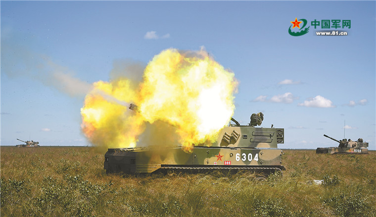 一波未平,一波又起。在俄方武装直升机的掩护下,中方参演部队30名机降队员在预定地域实施机降,对前沿之“敌”发起突袭。紧随其后,密集的炮弹飞向“敌”阵地,炮兵集群对“敌”指挥所和防空体系展开精确打击。轮式、履带两型火炮交替实施射击,首群覆盖目标。