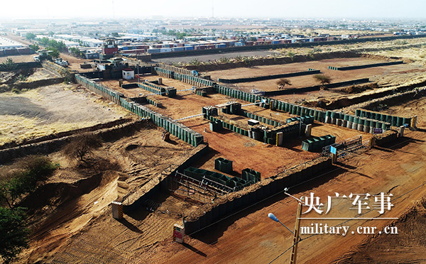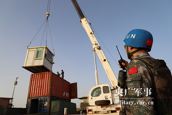 西门由中国警卫分队担负哨位执勤任务,原有三个哨位空间狭小、防护能力低,施工官兵将废旧集装箱“肢解重组”,并加装弹玻璃、防爆网箱,三个“锥形分布、视野开阔、防护力强”的新型集装箱岗楼映入眼帘。