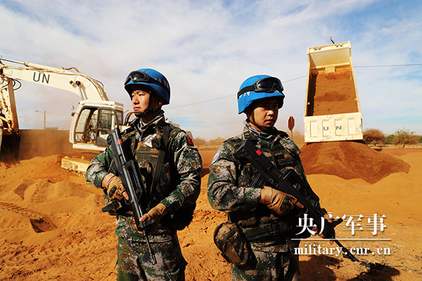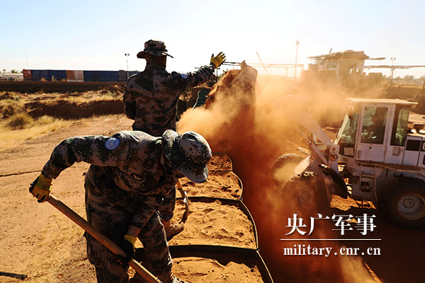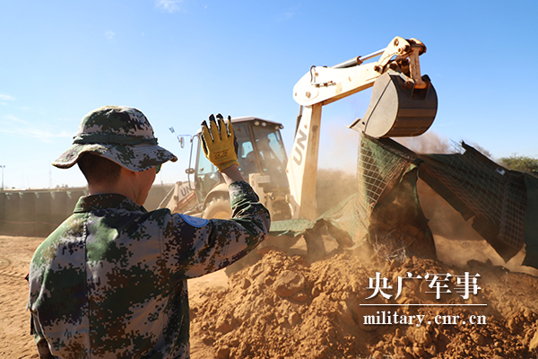 谈起高温,四度维和的老兵岳振印没觉得有啥,可装填防爆网箱时的黄沙漫天却让他刻骨铭心。他说:“装载机要在官兵的手势指挥下,才能完成精准填土任务,否则多了漏、少了缺。即使戴上口罩,可滚滚黄尘还是会让官兵们的耳鼻口“遭了罪”,丛林迷彩俨然蜕变为荒漠迷彩。”