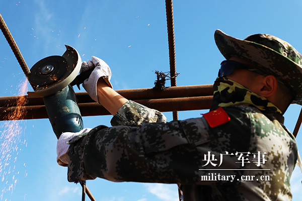 分队长张标在施工点对官兵们说:“我们越早完成西门改建任务,警卫分队官兵执勤就越安全,北门改造就能越早展开,联马团人员车辆就能越早安全便利的从西门进入超营,我们责任重大、使命光荣!”