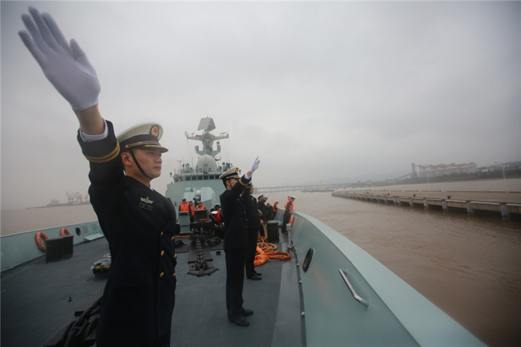 4月26日,中国海军湘潭舰从浙江舟山某军港解缆起航,官兵挥手致意。新华社发(张千 摄)