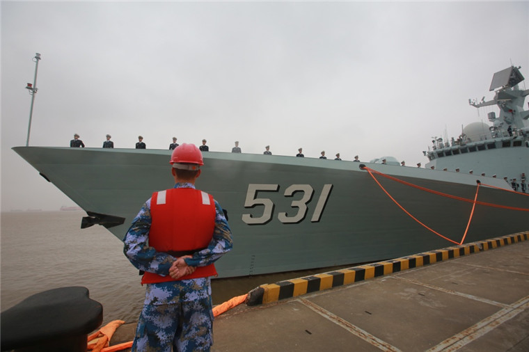 4月26日,中国海军湘潭舰从浙江舟山某军港解缆起航。新华社发(张千 摄)