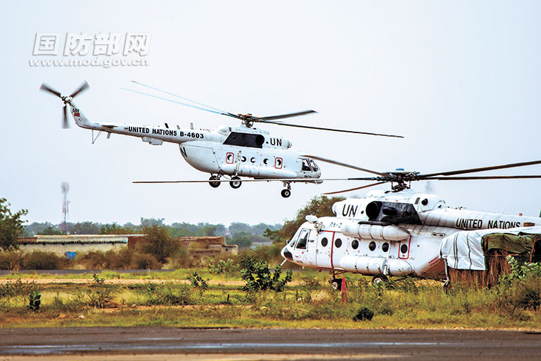 我第2批赴苏丹达尔富尔维和直升机分队直升机在法希尔机场起降。陈凯摄