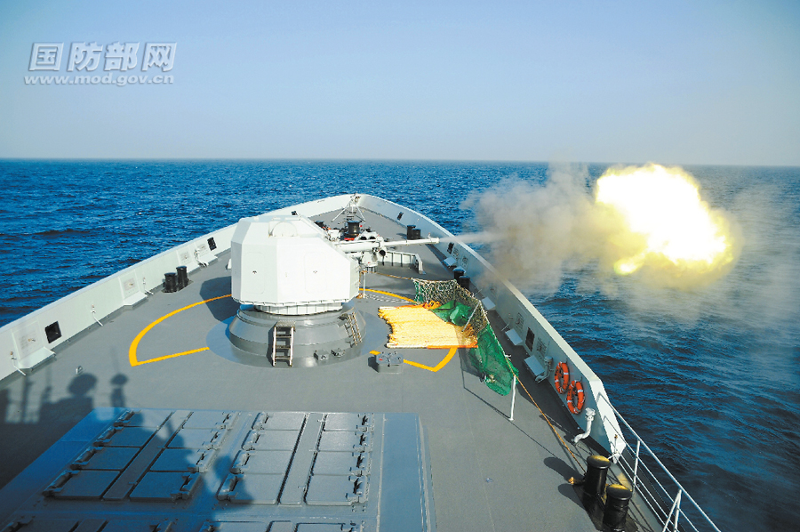 1月22日,中国海军第28批护航编队潍坊舰利用任务间隙,在亚丁湾海域进行主副炮射击训练,锤炼官兵实战本领。图为潍坊舰主炮开火射击的瞬间。李昊摄