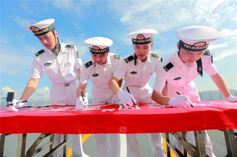 “我是中国人民解放军军人,我宣誓……”编队指挥员宣清松带领任务官兵面向八一军旗庄严宣誓。