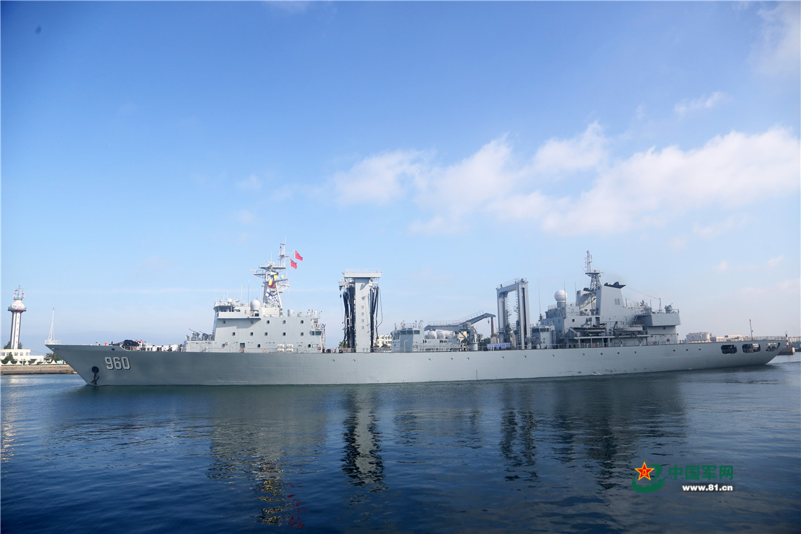 护航编队东平湖补给舰驶出青岛港。王松岐 摄