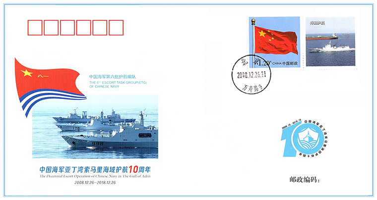 《中国海军亚丁湾索马里海域护航10周年》外宣纪念封第6枚,反映第六批护航编队护航经典瞬间。