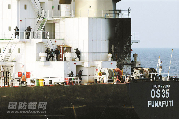 2017年4月9日,中国海军第25批护航编队玉林舰武力营救商船“0S35”号。图为海军特战队员快速登入商船展开营救行动。牛云海摄