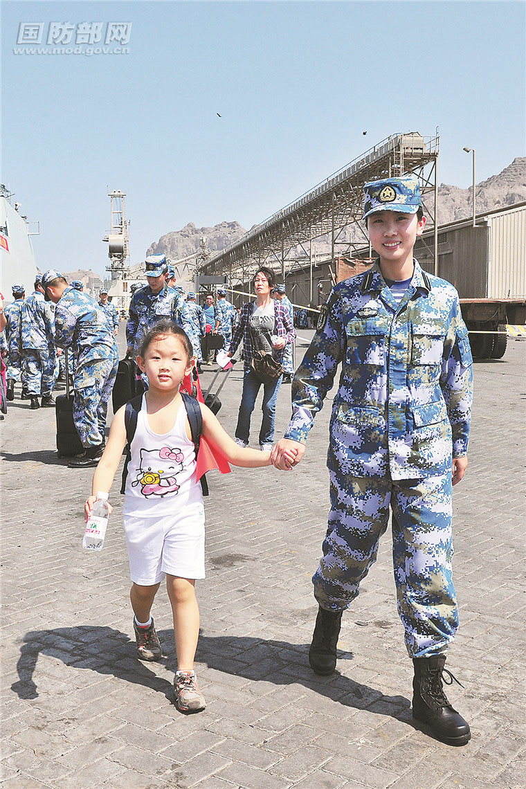 2015年3月29日,中国海军第19批护航编队临沂舰撤离我在也门的公民。图为女舰员帮助儿童登舰。熊利兵摄