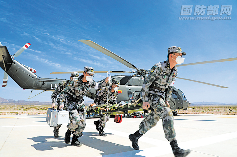8月20日,在直升机医疗后送救援演练中,我医疗分队官兵快速将“伤员”运送往医院。罗兴仓 摄