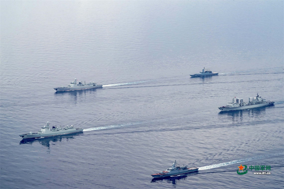 7月20日,在日本海中部海空域进行的“北部•联合-2023演习中,中俄参演舰艇编队开展海空护航演练。刘丹 摄