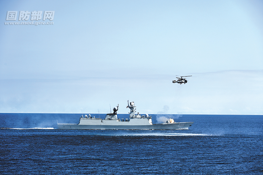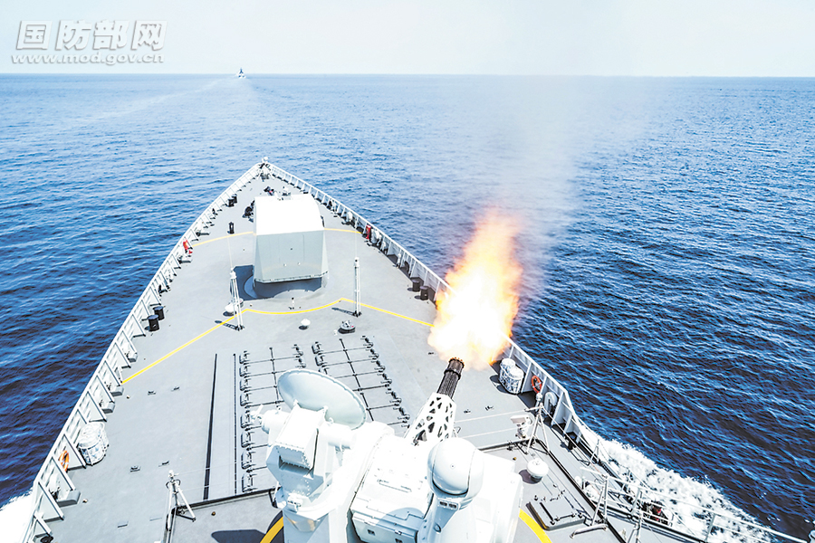 参演舰艇在演习中进行主副炮射击。解放军报记者 钱晓虎、刘 丹摄