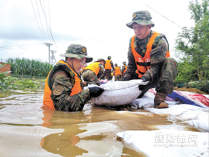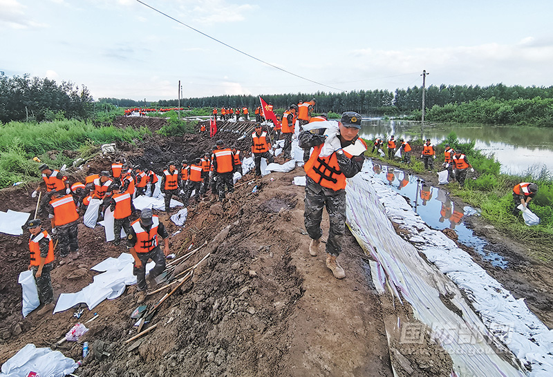 8月8日,北部战区陆军某旅官兵在哈尔滨市双城区万隆乡增产村垒筑堤坝。 新华社记者 杨思琪摄