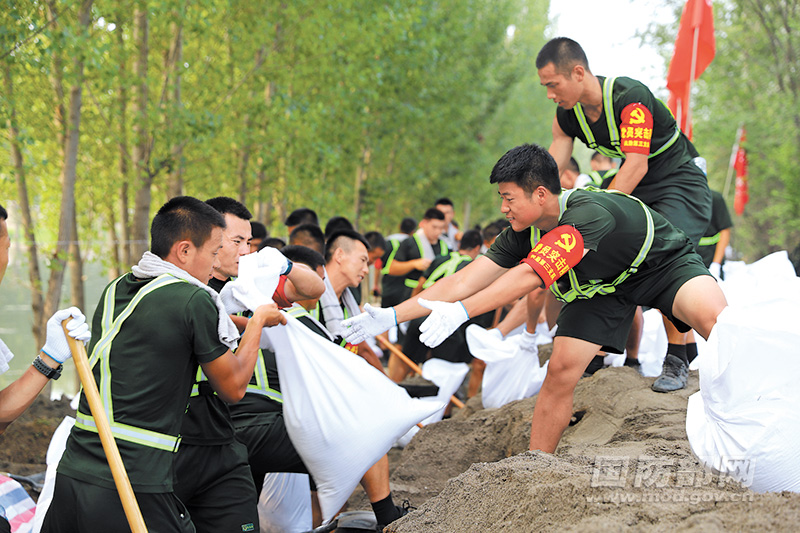 8月8日,第81集团军某旅官兵在天津市静海区大清河台头镇段加固堤坝。张济洋摄