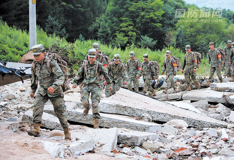 8月6日,第82集团军某旅抽调官兵组成党员突击队,携带救援物资,进入北京市房山区史家营乡杨林水村开展灾后救援。