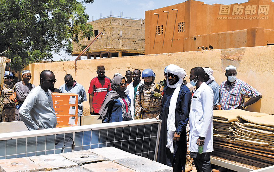 中国第10批赴马里维和防卫步兵分队近日向加奥大区医院捐赠太阳能发电设备,帮助医院解决电力短缺影响医疗救治的问题。加奥大区区长穆萨·特拉奥雷代表当地民众向分队表示感谢。图为捐赠活动现场。张 鑫摄