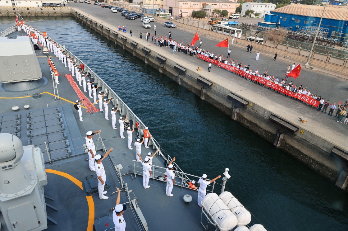 中国海军第44批护航编队淄博舰、荆州舰依次缓缓驶入科威特舒韦赫港(10月18日摄)。新华社发(方思航 摄)