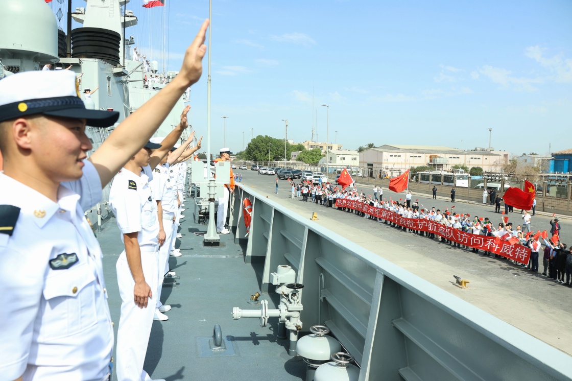 当地时间上午9时许,在科威特海军“法伊拉卡”号巡逻艇引导下,悬挂“中科友谊源远流长”“加强交流互信 友谊地久天长”等横幅的编队舰艇淄博舰、荆州舰和千岛湖舰缓缓驶入科威特舒韦赫港。科威特军方代表、中国驻科威特大使馆工作人员、华侨华人、中资企业代表等200余人到码头迎接。