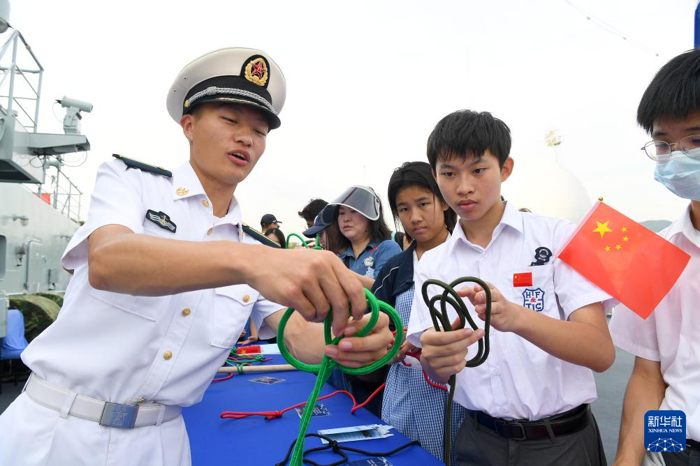 9月30日,参加舰艇开放活动的香港学生在戚继光舰上学习打绳结。新华社记者 陈铎 摄