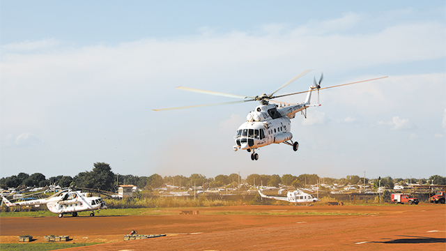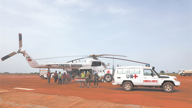 我第3批赴阿卜耶伊维和直升机分队出动一架直升机转运患者